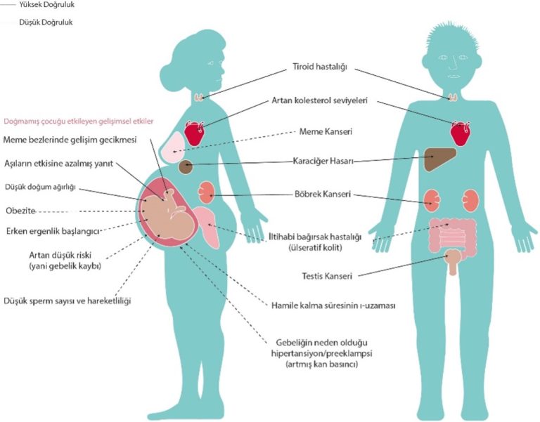 PFAS’lar endokrin sistem üzerinde bozucu etkiler yaratabilir; özellikle tiroid hormonlarında dengesizliklere neden olarak metabolizma sorunlarına yol açabilir. Kadınlarda adet düzensizlikleri, erkeklerde ise sperm kalitesinde azalma gibi üreme sağlığını etkileyen sonuçlar ortaya çıkabilir. Ayrıca PFAS maruziyeti karaciğer fonksiyonlarını bozabilir; karaciğer enzimlerinde artış ve yağlanma gibi etkiler gözlemlenmiştir. Bağışıklık sistemi de PFAS’tan olumsuz etkilenebilir; çocuklarda aşıya karşı bağışıklık yanıtı zayıflayabilir ve enfeksiyonlara karşı direnç azalabilir. Uluslararası ajanslar tarafından PFOA gibi bazı PFAS türleri “muhtemelen kanserojen” olarak sınıflandırılmış ve böbrek, testis ve karaciğer kanseri ile ilişkilendirilmiştir. Ayrıca LDL kolesterol seviyelerini artırarak kalp-damar hastalıkları riskini yükseltebilirler. Gebelikte maruziyet ise düşük doğum ağırlığı, erken doğum ve gelişim gerilikleriyle bağlantılıdır. Bazı araştırmalar çocuklarda PFAS maruziyetinin dikkat eksikliği, hiperaktivite ve bilişsel gelişim geriliği gibi nörolojik etkilerle ilişkili olabileceğini ortaya koymuştur. Hamileler, bebekler, çocuklar ve bağışıklığı zayıf bireyler PFAS’a karşı daha hassas gruplardır. PFAS vücuda genellikle içme suyu, kontamine gıdalar, hava, ev tozu ve mesleki maruziyet yoluyla alınır. Özellikle uzun süreli ve düşük düzeyde maruziyet bile ciddi sağlık sorunlarına neden olabileceğinden, bu kimyasallara karşı maruziyetin önlenmesi büyük önem taşır.